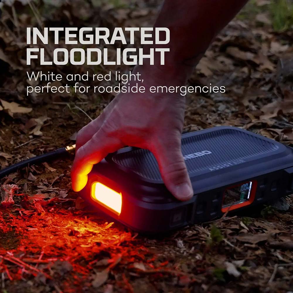 ARRANCADOR + COMPRESOR DE AIRE ASSIST AIR JUMP STARTER; LAS BATERÍAS DE COCHE AGOTADAS Y LOS NEUMÁTICOS PINCHADOS SON INESPERADOS E INCÓMODOS. ARRANCAR UN VEHÍCULO O CAMBIAR UNA RUEDA PINCHADA EN LA CARRETERA PUEDE SER INTIMIDANTE, PERO NO TIENE POR QUÉ SERLO. EL ARRANCADOR NEUMÁTICO NEBO® ASSIST™ LE PERMITE TOMAR EL CONTROL DE LA SITUACIÓN DE FORMA INDEPENDIENTE GRACIAS A SU UTILIDAD 4 EN 1, QUE PROPORCIONA ARRANQUE, INFLADO, CARGA Y LUZ. CON UNA POTENCIA DE 1500 AMPERIOS, PUEDE ARRANCAR CON CONFIANZA CUALQUIER BATERÍA DE 12V DE COCHE, TODOTERRENO, CAMIÓN O EMBARCACIÓN, Y ES APTO PARA MOTORES DE GASOLINA DE 8L Y DIÉSEL DE 4L. LA TECNOLOGÍA INTELIGENTE ESTÁ INTEGRADA EN EL DISEÑO A PRUEBA DE ERRORES, POR LO QUE LOS CABLES DE ARRANQUE SON A PRUEBA DE CHISPAS, MANTENIÉNDOLE SEGURO CON LO ÚLTIMO EN BATERÍA INTELIGENTE Y PROTECCIÓN DE CARGA PATENTADA. LA GUÍA DE ARRANQUE EN 3 PASOS ESTÁ CONVENIENTEMENTE IMPRESA DIRECTAMENTE EN LA BOLSA DE ALMACENAMIENTO DE MICROFIBRA, PARA QUE ESTÉ DISPONIBLE CUANDO LA NECESITE. EL NEBO ASSIST AIR TAMBIÉN ES RECARGABLE POR USB-C Y FUNCIONA COMO BANCO DE ENERGÍA PORTÁTIL PARA RECARGAR DISPOSITIVOS ALIMENTADOS POR USB, COMO SMARTPHONES O TABLETAS, Y TIENE UN REFLECTOR INTEGRADO, PARA QUE ESTÉS MEJOR PREPARADO PARA SITUACIONES DE EMERGENCIA EN CARRETERA. ENTRADA: 1xUSB-C PD 20W MAX QC3.0 Y PD COMPATIBLE (5V3A, 9V2.2A, 12V1,67A) SALIDA: 1xUSB-C(5V3A, 9V2.2A, 12V1,67A) 1xUSB-A(5V2A) 1xJUMP START(12VDC/1500A PICO). NEBO