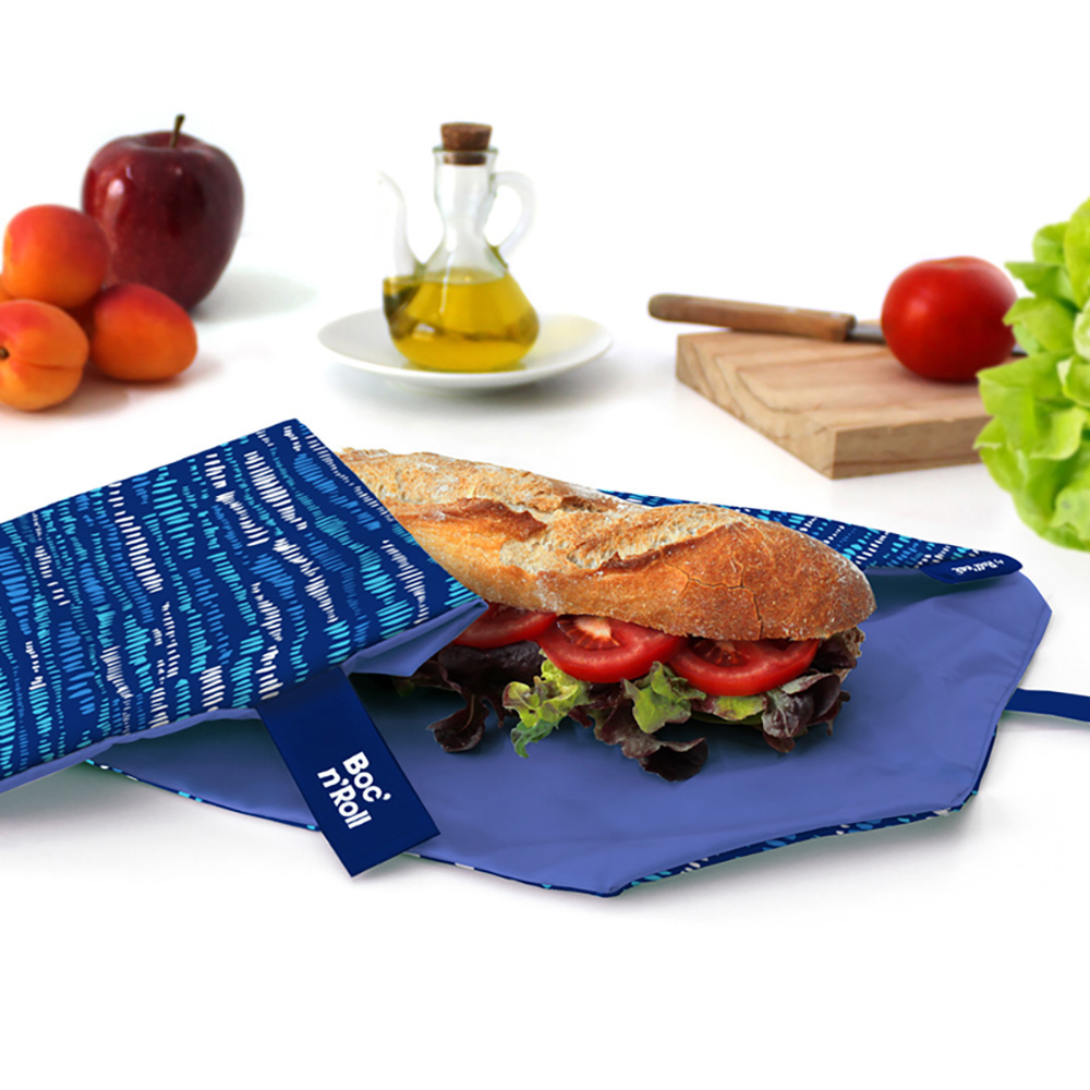 BOC’N’ROLL PORTA BOCADILLOS REUTILIZABLE BLUE MARINE. AJUSTABLE, PLEGABLE Y LAVABLE. DIMENSIONES CERRADO: 11x15cm, ABIERTO 54x32cm, EXTERIOR: 50% POLIESTER 50% ALGODON INTERIOR: TPU, CAPA INTERIOR ANTIMANCHAS E IMPERMEABLE. LIBRE DE PBA. SUJECCION ABSOLUTA: CIERRE CON VELCRO.