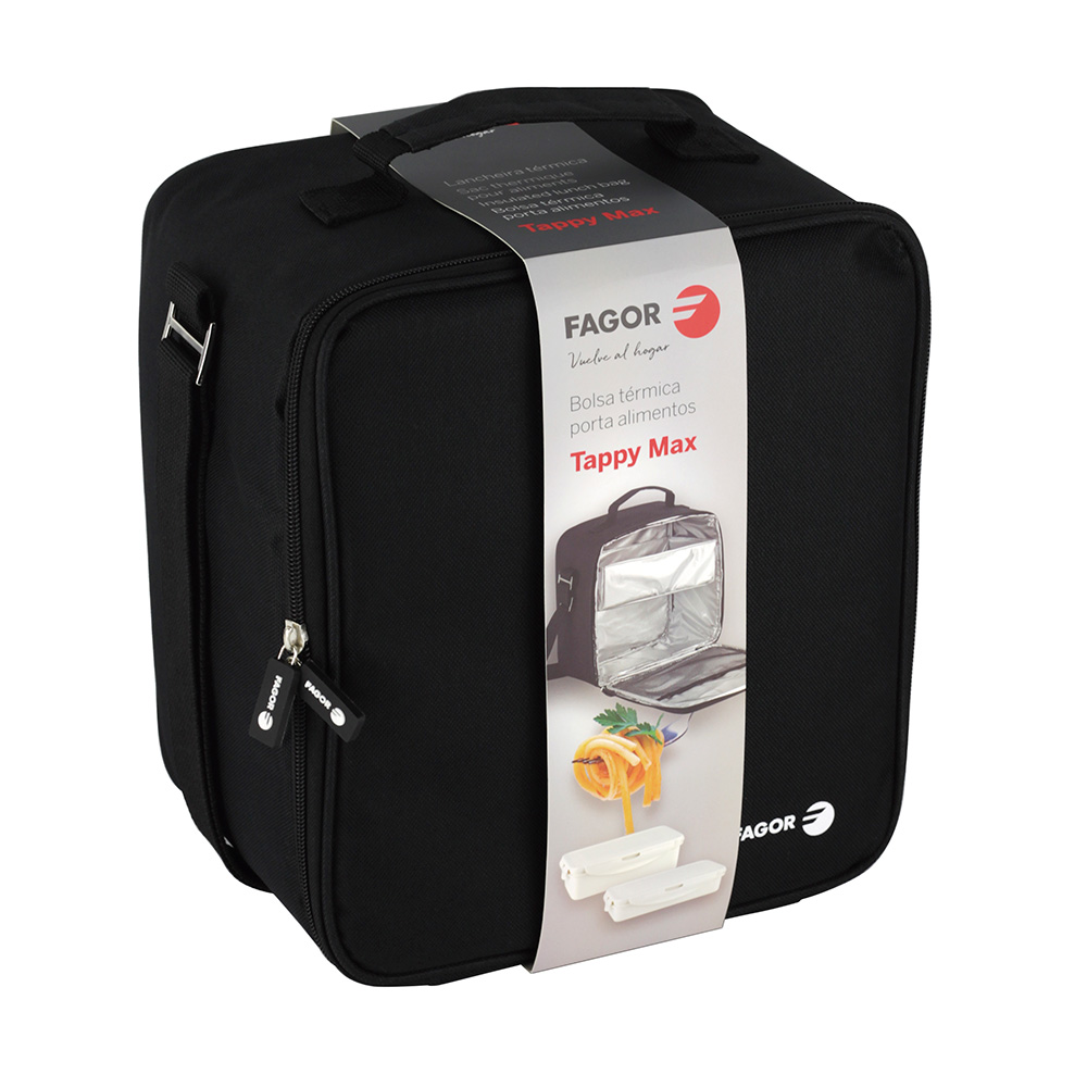 BOLSA PORTA ALIMENTOS TAPPY MAX (CON TUPPERS) FAGOR. MATERIAL SEMI-RIGIDO. RESISTENTE A LAS MANCHAS. AISLANTE INTERIOR FRIO/CALOR PARA CONSERVAR LOS ALIMENTOS CON LA TEMPERATURA DESEADA. CON ASA SUPERIOR Y BANDOLERA EXTENSIBLE. INCLUYE DOS CONTENEDORES HERMÉTICOS (0,82L Y 1.2L) APTOS PARA LAVAVAJILLAS, CONGELADOR Y MICROONDAS (EN EL CASO DEL MICROODNAS, SE RECOMIENDA INTRODUCIR SIN LA TAPA PARA NO DEFORMAR LAS JUNTAS Y MANTENER SU ESTANQUEIDAD INTACTA) 20×14,5x26cm (ancho/fondo/alto)