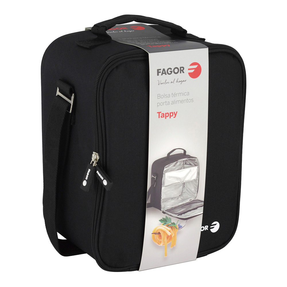 BOLSA PORTA ALIMENTOS TAPPY (SIN TUPPERS) FAGOR. MATERIAL SEMI-RIGIDO. RESISTENTE A LAS MANCHAS. AISLANTE INTERIOR FRIO/CALOR PARA CONSERVAR LOS ALIMENTOS CON LA TEMPERATURA DESEADA. CON ASA SUPERIOR Y BANDOLERA EXTENSIBLE. 17,5x17x24,5cm (ancho/fondo/alto)