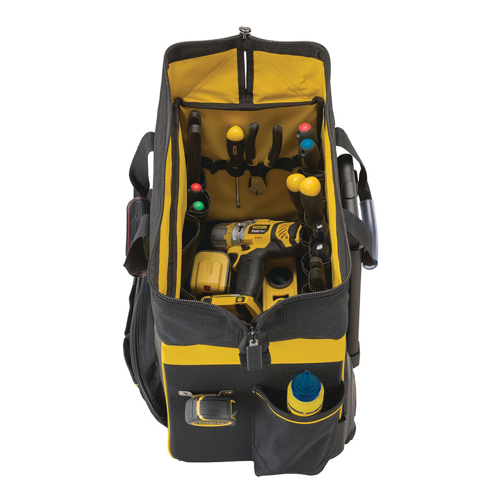 BOLSA RÍGIDA CON RUEDAS FATMAX. GRAN CAPACIDAD PARA GUARDAR DIFERENTES HERRAMIENTAS ELÉCTRICAS, HERRAMIENTAS MANUALES Y ACCESORIOS. ASA TELESCÓPICA DE GRAN RESISTENCIA. RUEDAS PARA UN FÁCIL TRANSPORTE. MÚLTIPLES COMPARTIMENTOS EN EL INTERIOR Y EXTERIOR PARA OBTENER LA MÁXIMA ORGANIZACIÓN DE LAS HERRAMIENTAS. DIVISOR INTERIOR EXTRAÍBLE. TAPA SUPERIOR CON UNA GRAN OBERTURA Y FÁCIL ACCESO. TEJIDO 600 DENIERS PARA RESISTIR DESGASTE Y RASGUÑOS. BOLSILLOS CON CIERRE PARA OBJETOS PERSONALES. STANLEY