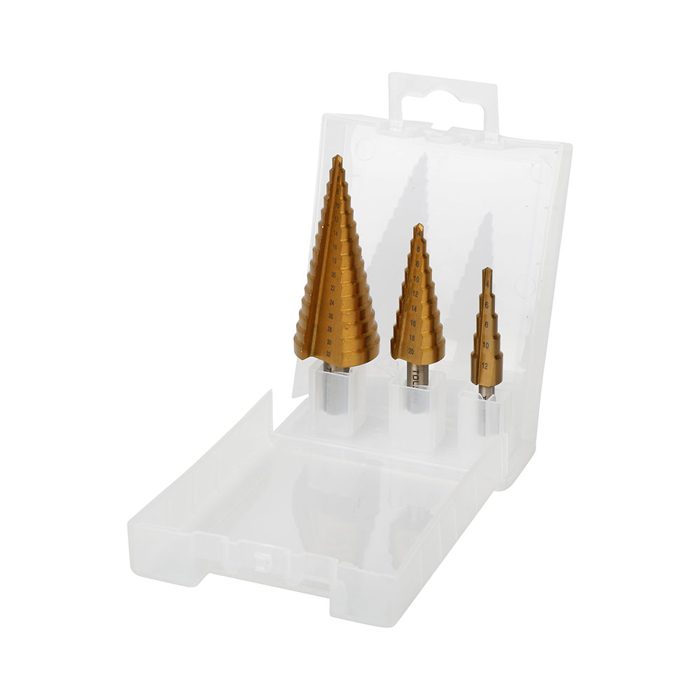 JUEGO DE 3 BROCAS ESCALONADAS MATERIAL HSS4241, TAMAÑOS: 1ª CON 15 ESCALONES: Ø4, 6, 8, 10, 12, 14, 16, 18, 20, 22, 24, 26, 28, 30 Y 32 mm; 2ª CON 9 ESCALONES: Ø4, 6, 8, 10, 12, 14 , 16, 18 Y 20mm; 3ª CON 9 ESCALONES: Ø4, 5, 6,7, 8, 9 10, 11 Y 12mm. WORKPRO