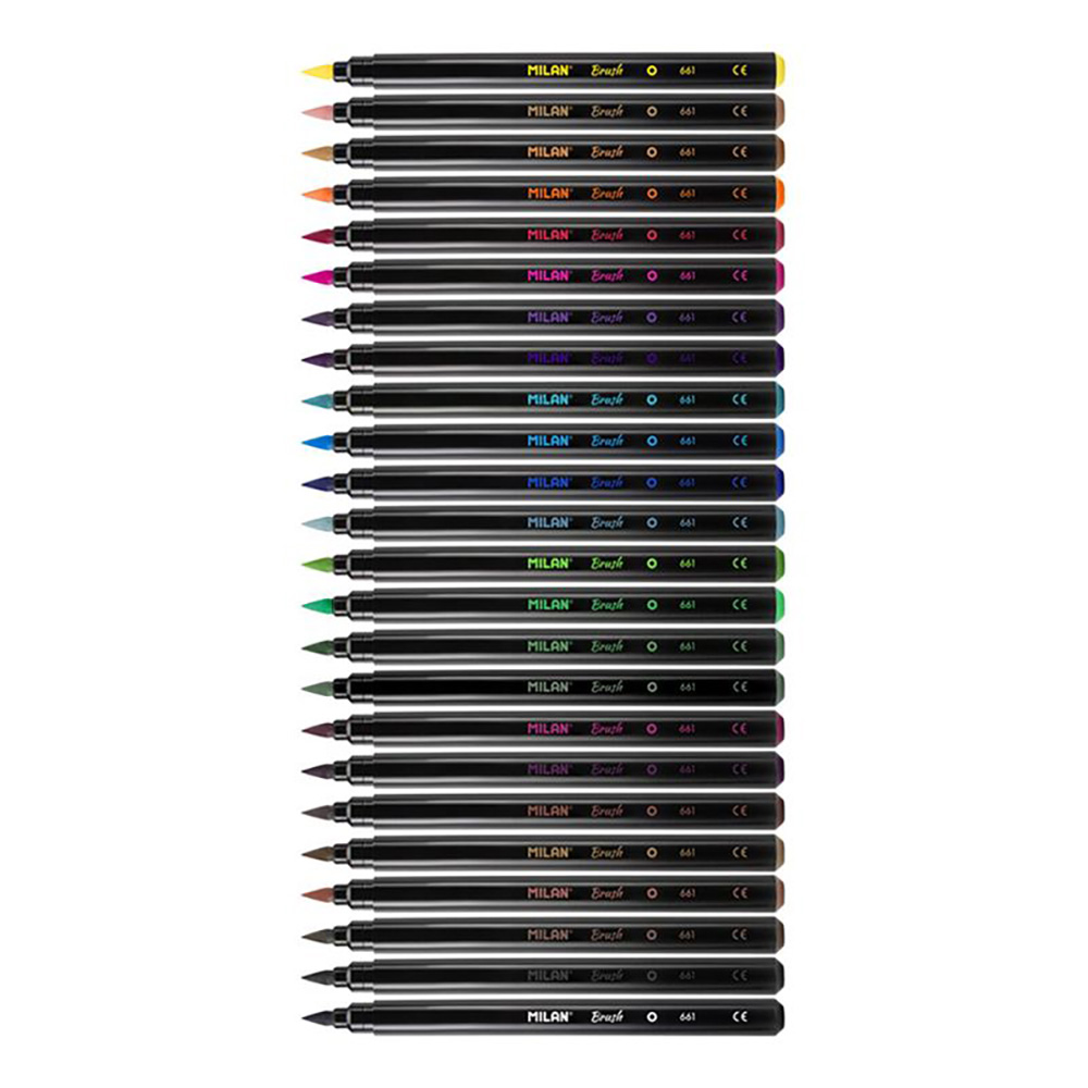 CAJA CON 24 ROTULADORES DE PUNTA DE PINCEL BASE AGUA MILAN. ROTULADORES QUE OFRECEN UN TRAZO DE PINCEL DESDE 0,5 MM A 4 MM. IDEAL PARA CALIGRAFÍA Y PINTAR CON DISTINTOS TRAZOS MEZCLANDO SUS COLORES. 24 COLORES. PUNTA DE FIBRA. TINTA A BASE DE AGUA QUE PROPORCIONA UNOS COLORES BRILLANTES DE FÁCIL APLICACIÓN YMEZCLABLES ENTRE SÍ. PUEDE LAVARSE FÁCILMENTE SOBRE LA MAYORÍA DE TEJIDOS (PONER LA PRENDA EN REMOJO EN AGUA FRÍA DURANTE UNA HORA Y LAVAR A MÁQUINA, TAMBIÉN CON AGUA FRÍA). CON CAPUCHÓN DE SEGURIDAD VENTILADO.
