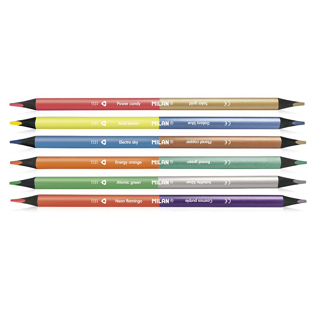 CAJA CON 6 LÁPICES BICOLOR TRIANGULARES MADERA NEGRA (COLORES FLUO + METALIZADOS) MILAN. LÁPICES BICOLORES CON MINA DE Ø2,9mm. 6 LÁPICES, 12 COLORES (COLORES FLUO + COLORES METALIZADOS). FORMA TRIANGULAR ERGONÓMICA. LA MINA OFRECE UN TRAZO UNIFORME Y ES RESISTENTE A LA ROTURA, GRACIAS AL SISTEMA LPS (LEAD PROTECTION SYSTEM) QUE PROTEGE LA MINA GRACIAS A SU ADHESIÓN CON LA MADERA. MADERA PROCEDENTE DE PLANTACIONES SOSTENIBLES. CADA COLOR CUENTA CON UN NOMBRE PROPIO.