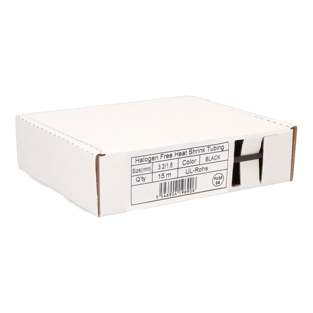 CAJA TERMORETRACTIL DOSIFICADORA Ø3,2 – 1,6 mm; 15m. CAJA DOSIFICADORA NEUTRA TERMO-RETRACTIL Ø3,2 – 1,6 mm; COLOR NEGRO 15m. PRIMERA MEDIDA ANTES DE CONTRAER Y LA SEGUNDA MÁXIMA CONTRACCIÓN TRAS CALENTADO.