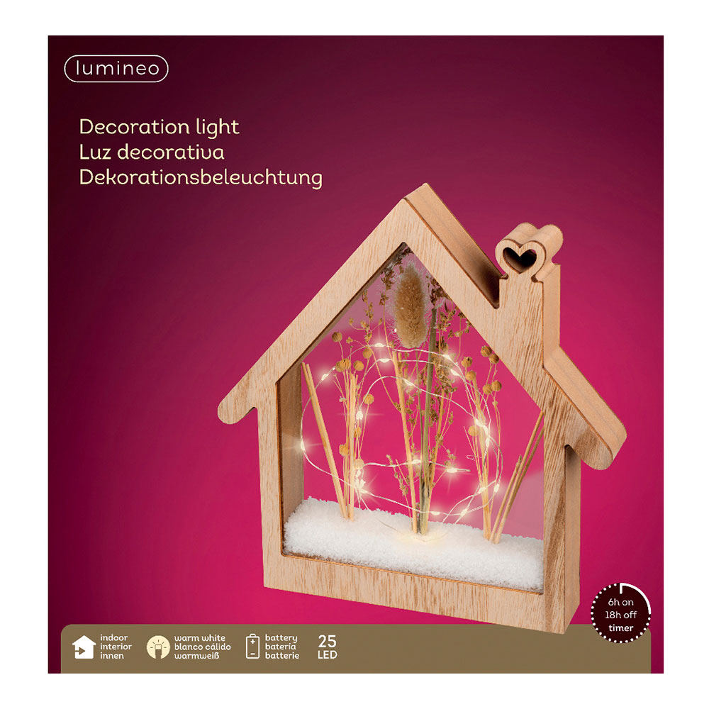 CASITA DE MADERA CON MICROLEDS 4,30x26x27cm 25 LEDS. IP20 INTERIOR, LUZ CÁLIDA, CON ELEMENTOS NATURALES, 2xAAA, CON PROGRAMADOR