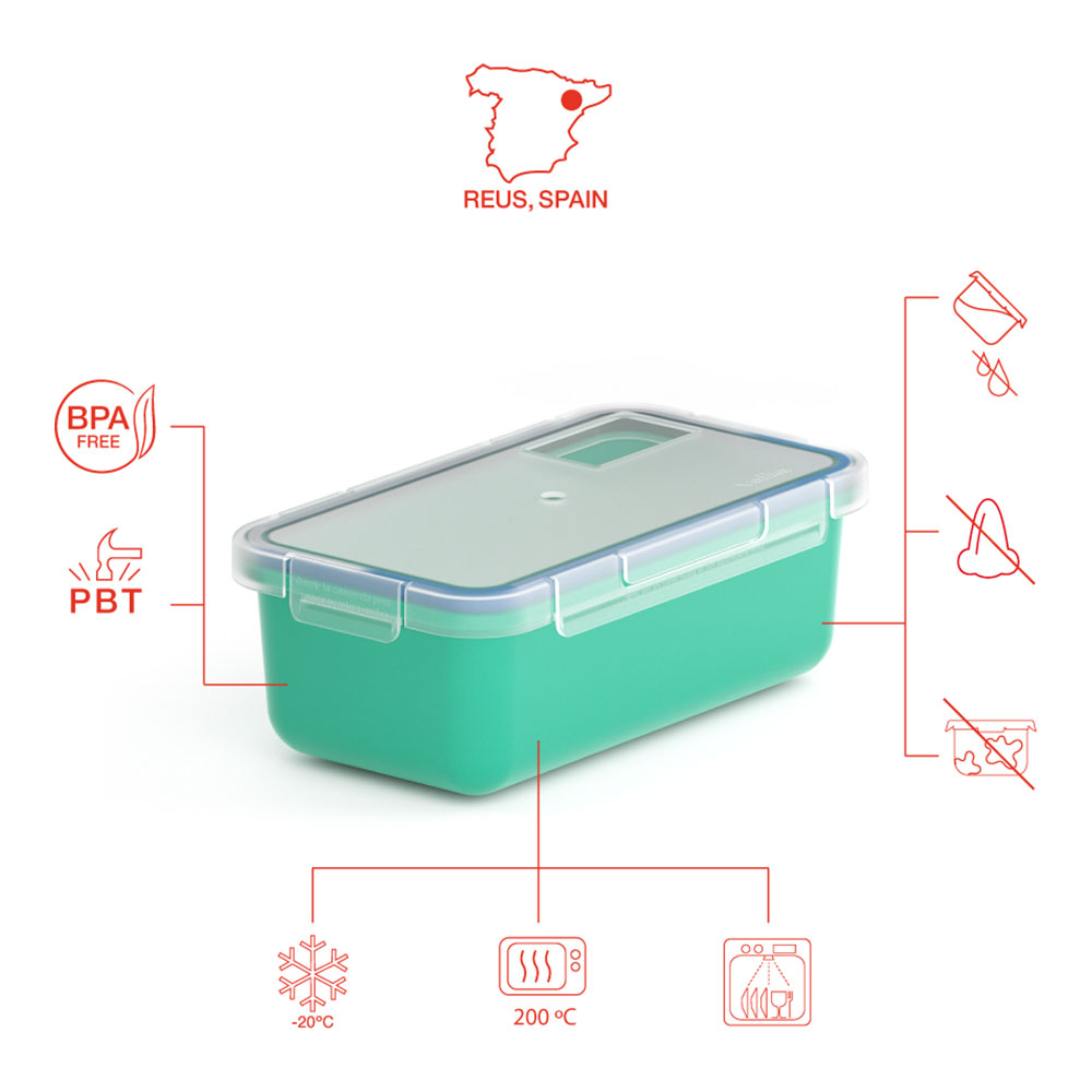 CONTENEDOR HERMÉTICO 0,75L TURQUESA 6090/97 VALIRA. FABRICADO EN REUS (ESPAÑA). TERMOPLÁSTICO (PBT) ADECUADO PARA CONTACTO CON ALIMENTOS, LIBRE DE BPA. 100% HERMÉTICO GRACIAS A LOS 4 PUNTOS DE ANCLAJE DE LA TAPA Y SU JUNTA. FABRICADO CON ENERGÍA ELÉCTRICA 100% RENOVABLE. NO SE MANCHA, NO COGE OLORES, NO SE DEFORMA. APTO PARA MICROONDAS, LAVAVAJILLAS Y CONGELADOR (-20ºC HASTA 200ºC). TAPA TRANSLÚCIDA CON VENTANA PARA VER CLARAMENTE EL INTERIOR. MATERIAL: CUERPO DE PBT, TAPA DE POLIPROPILENO Y JUNTA DE SILICONA.