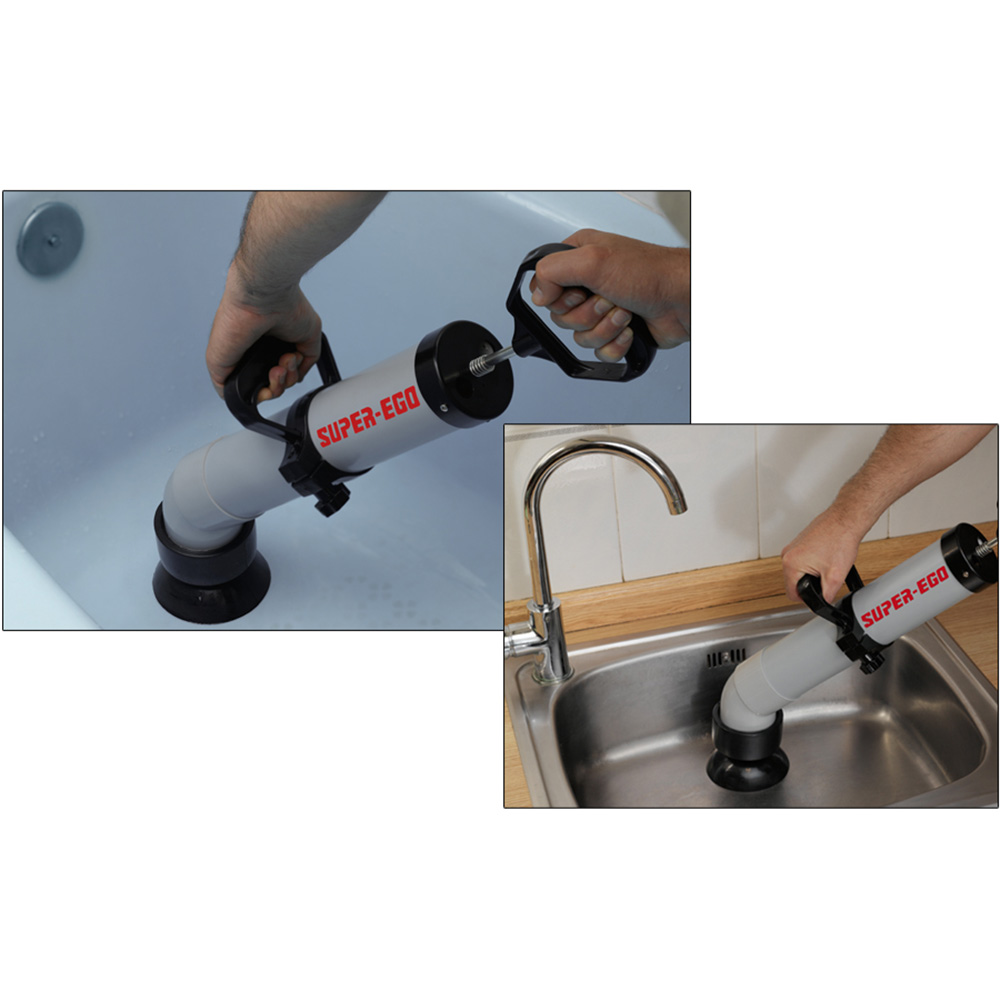 DESATASCADOR POR AIRE SEH000200 SUPER EGO. INDICADA PARA ELIMINAR PEQUEÑOS ATASCOS DOMÉSTICOS EN LAVABOS, FREGADEROS, BIDÉS, ETC. FÁCIL MANEJO. CON ASA ADICIONAL QUE SE PUEDE MOVER PARA FACILITAR EL DESATASCO. INCLUYE ADPTADORES ESPECÍFICOS PARA DESATASCAR INODOROS, LAVABOS Y DUCHAS. CAPACIDAD DE BOMBEO: 1,3 LITROS.