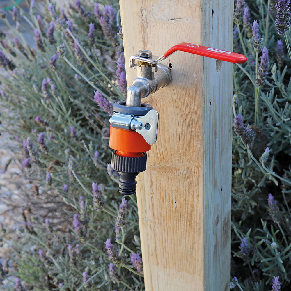 ENCHUFE PARA GRIFO SIN ROSCA CON ABRAZADERA Y ENCHUFE RAPIDO Ø18mm MACHO COLOR: GRIS/NARANJA. MATERIAL: POLIPROPILENO. TRATAMIENTO ANTI UV Y ANTI