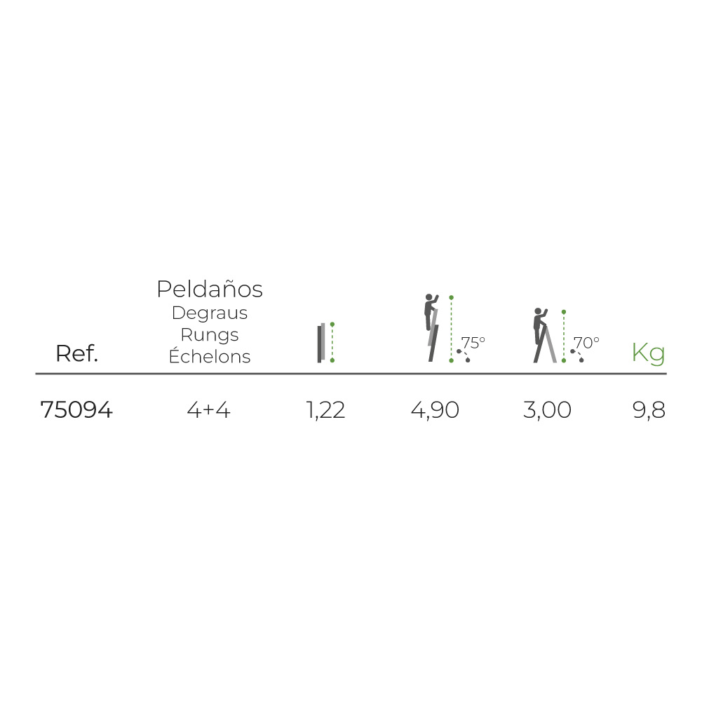 ESCALERA MULTIFUNCIÓN TELESCÓPICA 2×4+4 PELDAÑOS MATERIAL: ALUMINIO, PESO DE LA ESCALERA: 9,8kg. PESO MÁXIMO: 150kg. LONGITUD MÁXIMA EN USO EXTENDIDA 4.30m, LONGITUD MÁXIMA EN USO EN TIJERA 3m. BISAGRA DE ACERO CON SISTEMA DE BLOQUEO, EN131