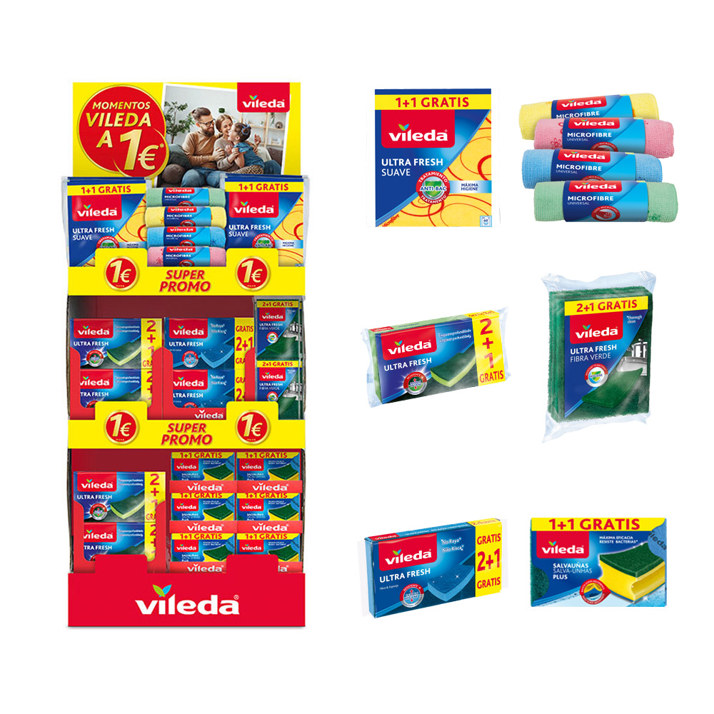 EXPOSITOR MOMENTOS VILEDA A 1€. INCLUYE: 77614×48 unid, 77610×32 unid, 77711×48 unid, 77693×24 unid, 77662×48 unid, 77694×24 unid. AHORRA HASTA UN 20% CON LA COMPRA DE ESTE EXPOSITOR.