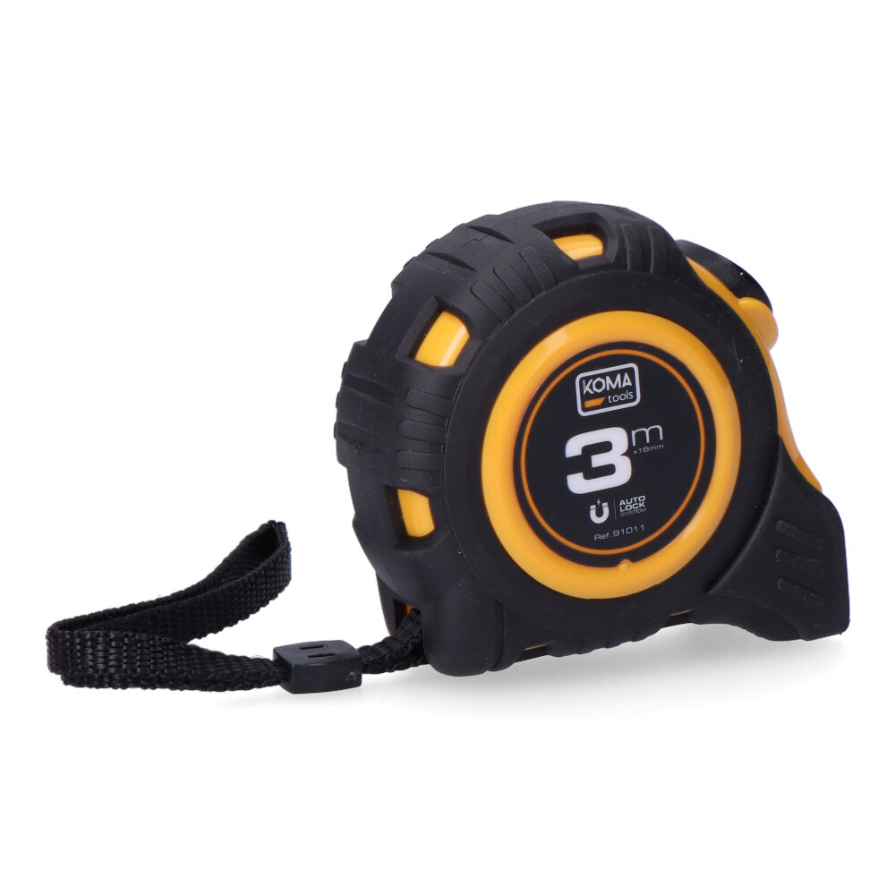 FLEXÓMETRO 3m x 16mm ABS MAGNET KOMA TOOLS. CUERPO FABRICADO EN ABS ANTIDESLIZANTE. GANCHO MAGNÉTICO. UNA POSICIÓN DE BLOQUEO Y SISTEMA AUTO LOCK. CLIP PARA CINTURÓN. GROSOR DE LA CINTA 0,115mm, CINTA NUMERACIÓN AMARILLA ACABADO MATE.