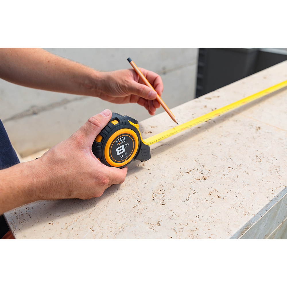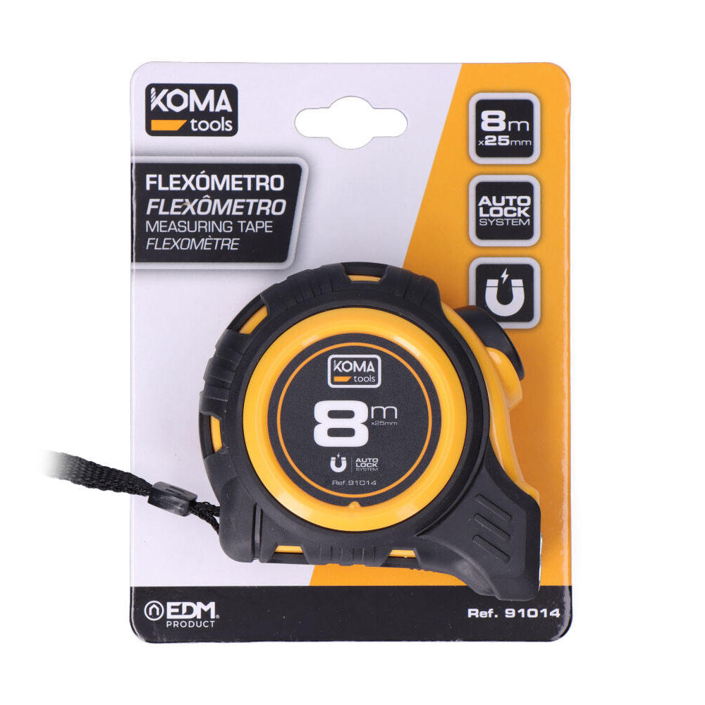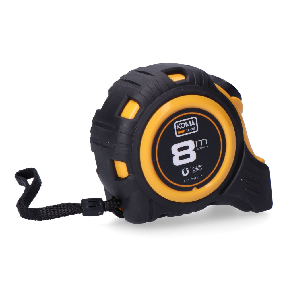 FLEXÓMETRO 8m x 25mm ABS MAGNET KOMA TOOLS. CUERPO FABRICADO EN ABS ANTIDESLIZANTE. GANCHO MAGNÉTICO. UNA POSICIÓN DE BLOQUEO Y SISTEMA AUTO LOCK. CLIP PARA CINTURÓN. GROSOR DE LA CINTA 0,115mm, CINTA NUMERACIÓN AMARILLA ACABADO MATE.