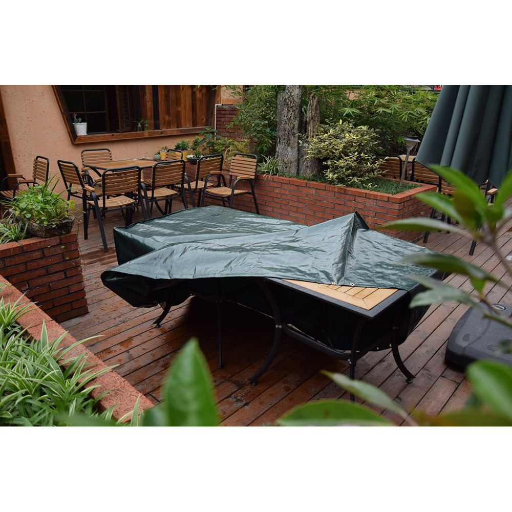 FUNDA PROTECCIÓN CUBRE MESA Y SILLAS 143x225x90cm (ancho/fondo/alto). MATERIAL POLIÉSTER 240g/m². IMPERMEABLE. FORMA RECTANGULAR. INCORPORA BOLSILLOS TRANSPIRABLES EN LOS LATERALES. OJALES QUE FACILITAN SU ATADO Y/O SUJECIÓN. INCLUYE CUERDA DE SUJECIÓN.