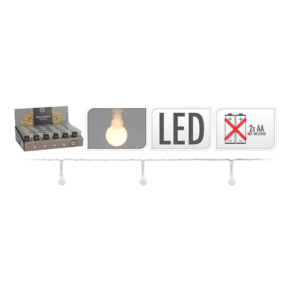 GUIRNALDA A PILAS FIJA 20 LEDS ESFERICA 8mm LUZ BLANCO CALIDO PILAS 2xAA NO INCLUIDAS IP20 CABLE TRANSPARENTE 10cm ENTRE BOMBILLAS LED CABLE ALIMENTACIÓN 30cm. DISTANCIA ENTRE LA PRIMERA BOMBILLA Y LA ULTIMA 2m. LARGO TOTAL: 2,3m