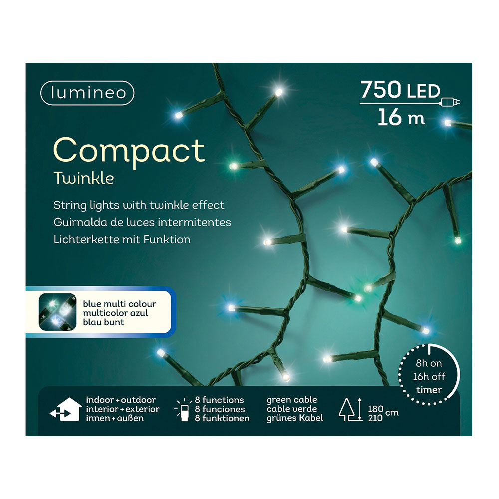 GUIRNALDA LED COMPACT PARPADEANTE COLORES BLANCO, AZUL Y TURQUESA 750 LEDS CABLE VERDE. EXTERIOR IP44, CABLE ALIMENTACIÓN 5m. DISTANCIA ENTRE LA PRIMERA BOMBILLA Y LA ULTIMA 16m. LARGO TOTAL: 21m.