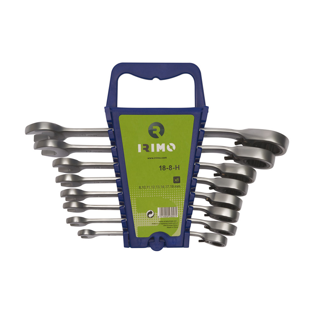 JUEGO 8 LLAVES COMBINADAS CARRACA/FIJA 8-19mm 18-8-H. JUEGO DE 8 PIEZAS CON SOPORTE DE PLÁSTICO. COMPONENTES: LLAVES COMBINADAS CON CARRACA DE 8 A 19 mm. PALANCA DE CAMBIO RÁPIDO DE SENTIDO IZQUIERDA/DERECHA. ÁNGULO DE 15º PARA MEJORAR LA MANIPULACIÓN Y EL ACCESO. ACABADO: CROMADO MATE. MATERIAL: ALEACIÓN DE ACERO DE ALTO RENDIMIENTO. DUREZA: 40-50 HRC. NORMAS: ISO 1711-1 Y DIN 3113.