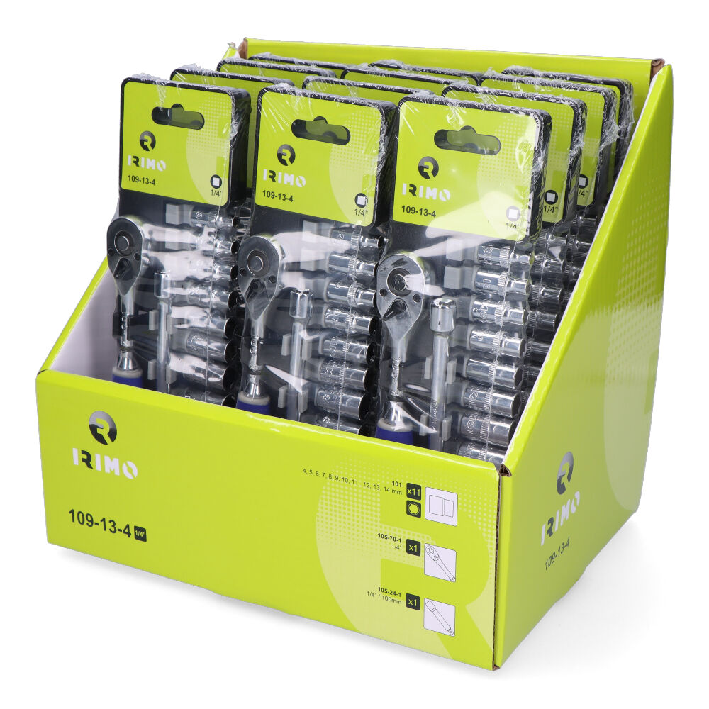 JUEGO DE CARRACA 1/4″, VASOS Y ALARGADOR, 13 PIEZAS 109-13-4. JUEGO DE VASOS DE 1/4″ EN EXPOSITOR. JUEGO DE 11 VASOS+CARRACA+ALARGADOR. VASOS HEXAGONALES EN DIMENSIONES MÉTRICAS. ACABADO CROMADO BRILLANTE. EL EXPOSITOR INCLUYE 12 JUEGOS. DIN 3120, DIN 3124 Y DIN 3122.»