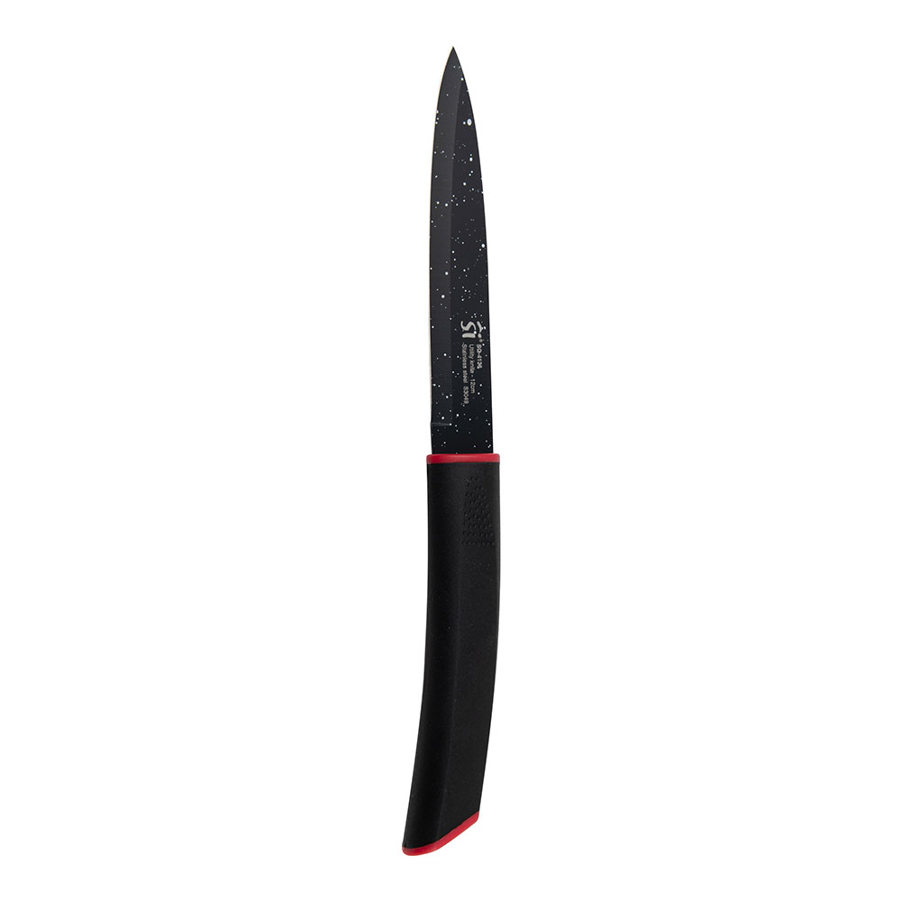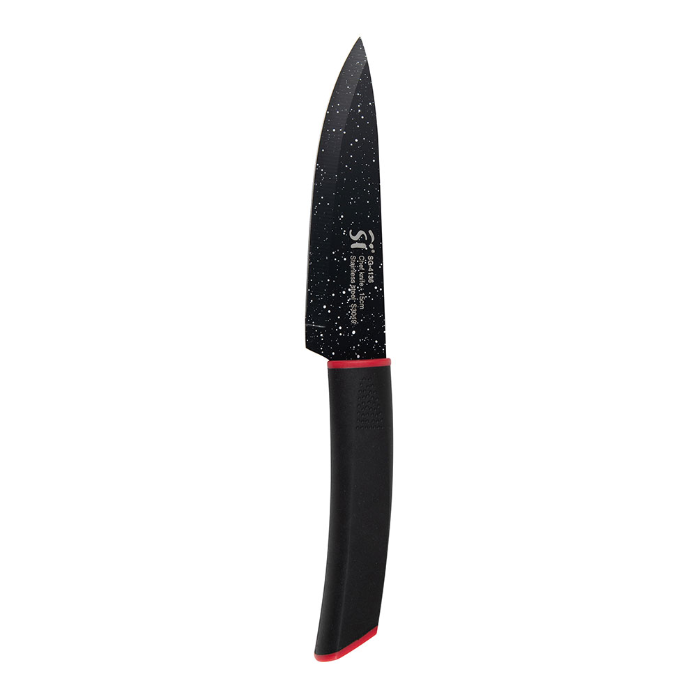 JUEGO DE 3 CUCHILLOS ACERO INOXIDABLE CON REVESTIMIENTO DE MÁRMOL 1 CUCHILLO DE CHEF 29,5 x 4,5 x 2,6 cm 1 CUCHILLO MULTIUSOS 25 x 2,5 x 2 cm. 1 CUCHILLO DE PELAR 21,5 x 2,5 x 2,0 cm MANGO NEGRO INSERTO DE COLOR ROJO