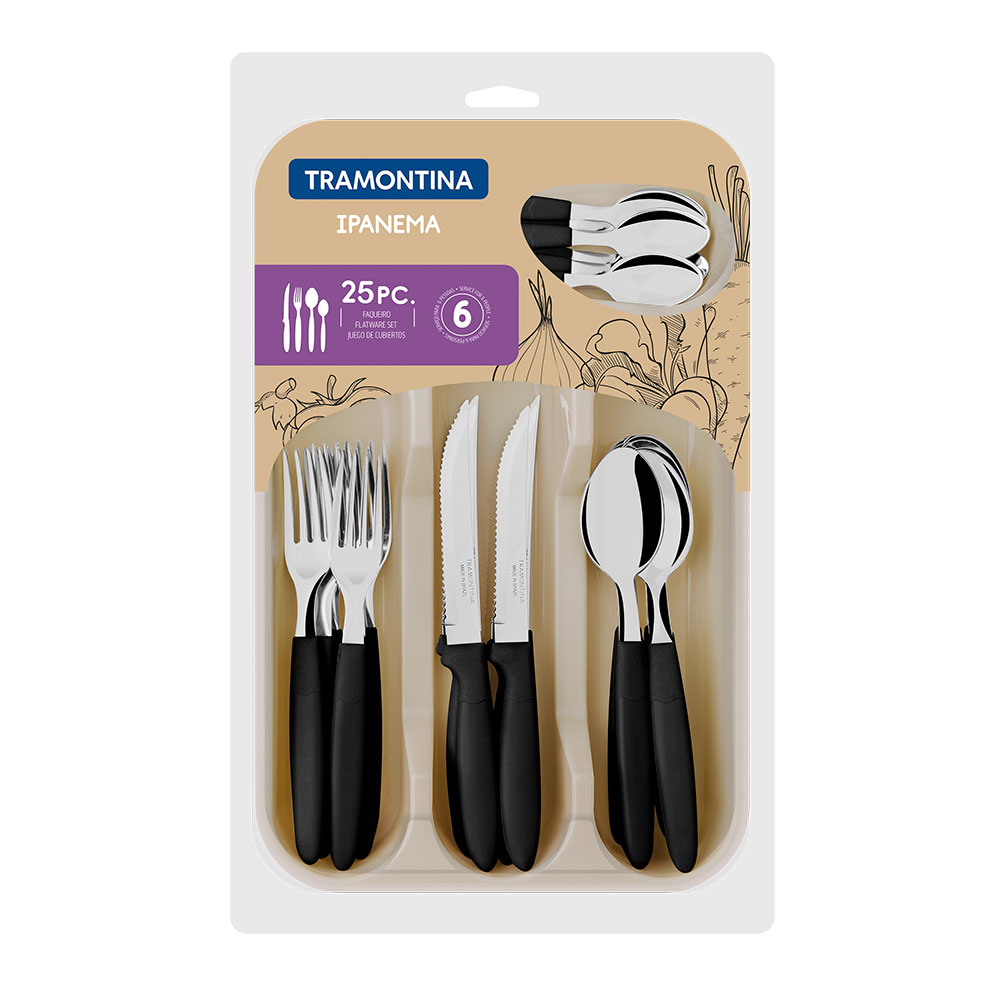 JUEGO DE CUBIERTOS DE 25 PIEZAS IPANEMA NEGRO TRAMONTINA. JUEGO DE CUBIERTOS IPANEMA, EN ACERO INOXIDABLE, MANGOS DE POLIPROPILENO, CON ORGANIZADOR DE CUBIERTOS, SET PARA USO DIARIO, INCLUYE 25 PIEZAS, COLOR NEGRO. ACERO INOXIDABLE: LOS CUBIERTOS IPANEMA ESTÁN ELABORADOS CON LÁMINAS DE ACERO INOXIDABLE, QUE TIENE MÁS DURABILIDAD DEBIDO AL TRATAMIENTO TÉRMICO, SU ESPESOR Y AL ESTAMPADO DE LAS PROPIAS LÁMINAS. MANGOS DE POLIPROPILENO: LOS CUBIERTOS DE ESTE SET TIENEN LOS MANGOS EN COLOR NEGRO Y ESTÁN ELABORADOS CON POLIPROPILENO, QUE PROPORCIONAN UNA MAYOR RESISTENCIA Y DURABILIDAD.