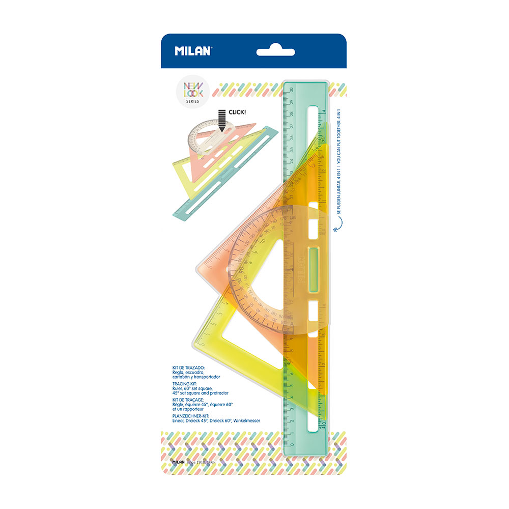 KIT DE REGLAS DE TRAZADO NEW LOOK: REGLA 3cm (VERDE), ESCUADRA 90° / 45° / 45° (NARANJA), CARTABÓN 90° / 60° / 30° (AMARILLO) Y TRANSPORTADOR 180° 10cm (BEIGE). DE PLÁSTICO RÍGIDO, TRANSPARENTE Y RESISTENTE. CON MEDIDAS EN CENTÍMETROS Y EN PULGADAS. LAS 4 PIEZAS SE PRESENTAN ENSAMBLADAS.