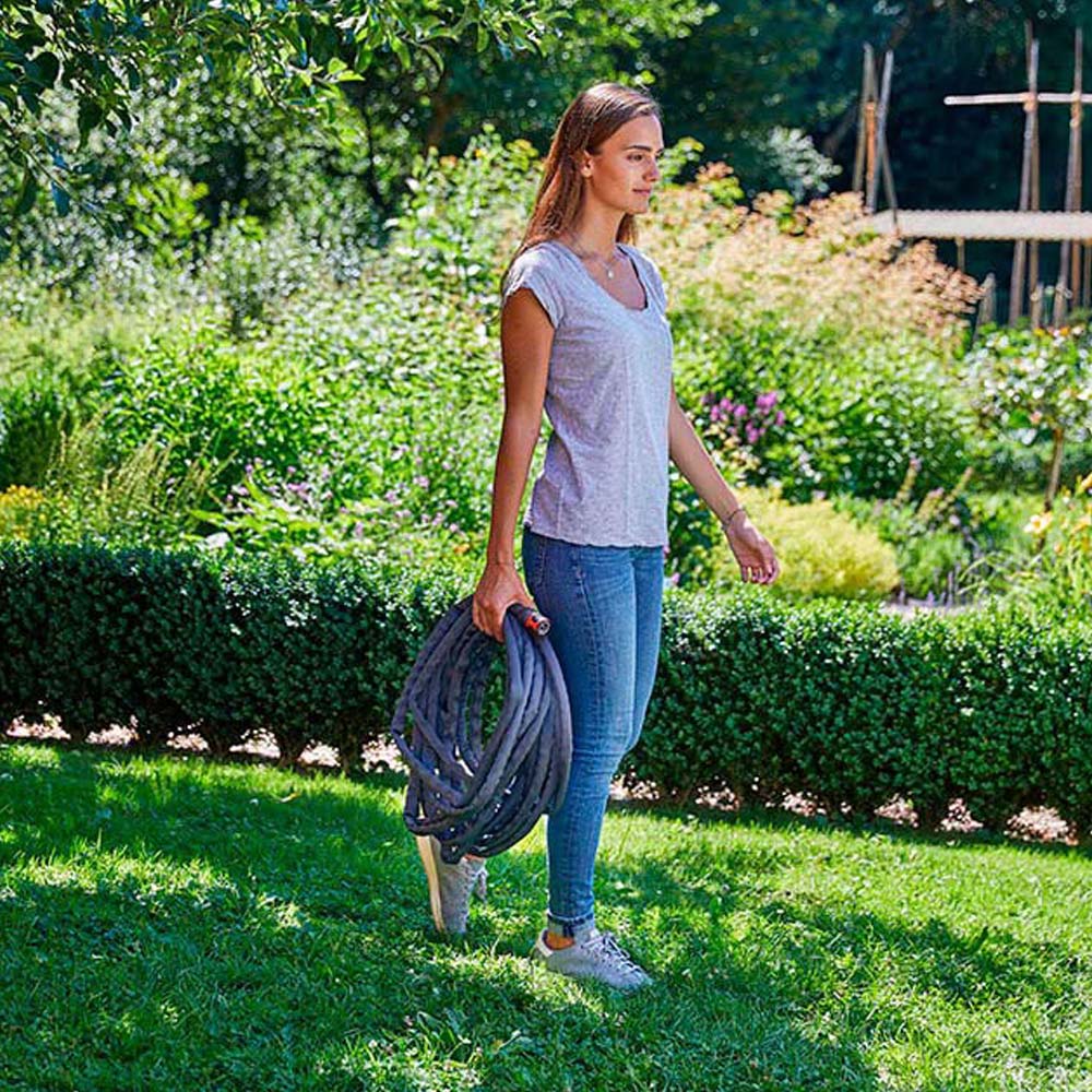 KIT MANGUERA LIANO COLOR GRIS. LONGITUD 15m. Ø13mm (1/2″). COMPLETO, CON CONEXIONES ORIGINAL GARDENA SYSTEM, LANZA ROCIADORA Y CONEXIÓN AL GRIFO, 18200/18202/5305 Y 18310. LIBRE DE FTALATOS Y METALES PESADOS, RESISTENTE A LOS RAYOS UV Y A LAS HELADAS, REPELE LA SUCIEDAD Y NO DAÑA LA CUBIERTA EXTERIOR EN CUALQUIER SUPERFICIE. GARDENA