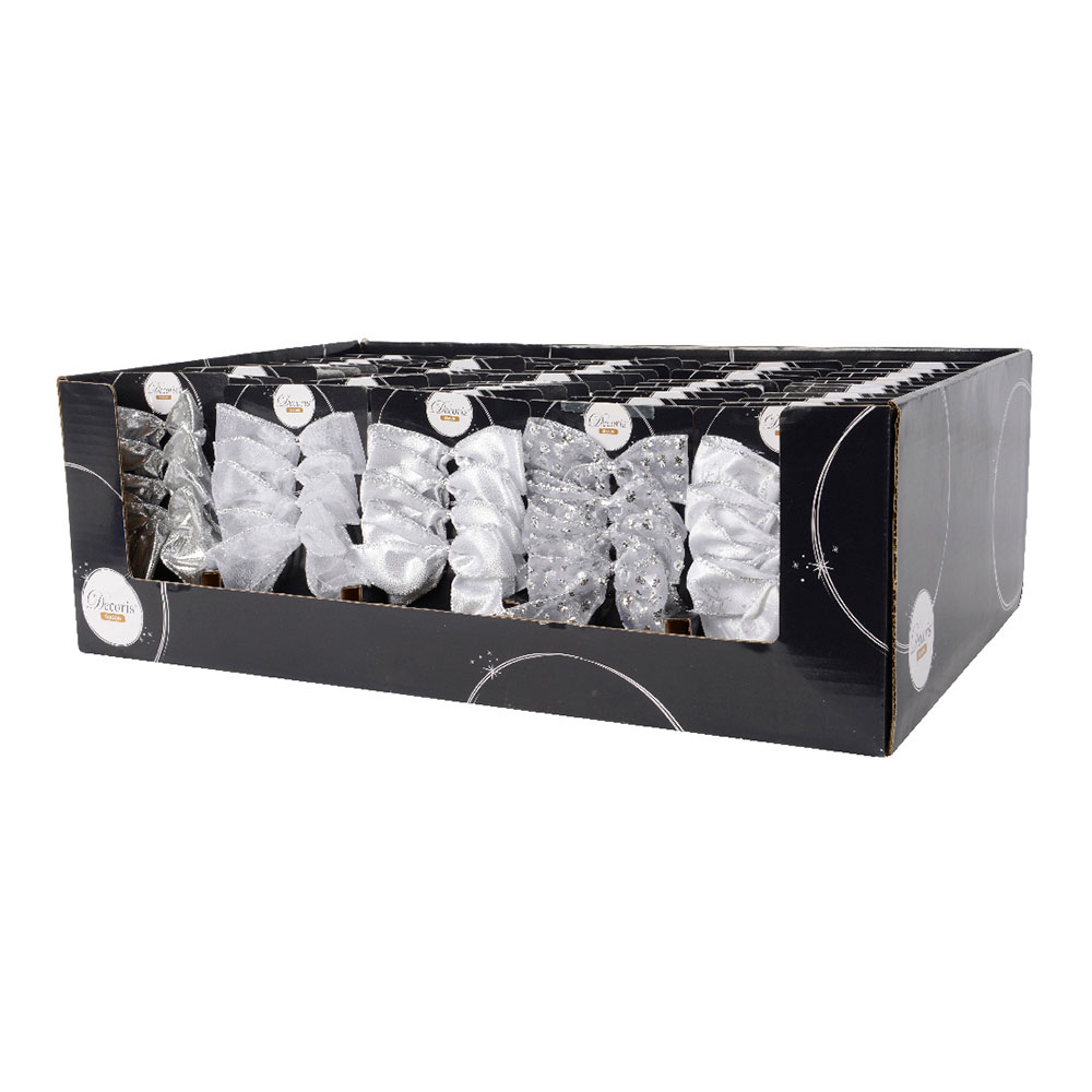 LAZOS DE POLIESTER PLATA PARA DECORACIÓN SURTIDOS. POLIÉSTER PLATA EN LISO- 3,8cm x 11,4cm x 8,9cm CON ALAMBRE- POLIÉSTER BLANCO TRANSPARENTE EN LISO- 3,8cm x 11,4cm x 8,9cm CON ALAMBRE- POLIÉSTER BLANCO SATÉN CON PUNTOS EN LA SUPERFICIE- 3,8cm ALAMBRE DE 3,8cm x 11,4cm x 8,9cm DE ANCHO – TRANSPARENTE POLIÉSTER BLANCO CON PUNTOS DE BRILLO REGULARES – ALAMBRE DE 3,8cm x 11,4cm x 8,9cm – ALAMBRE DE RASO DE POLIÉSTER BLANCO CON ÁRBOL DE NAVIDAD – ALAMBRE DE 3,8cm x 11,4cm x 8,9cm