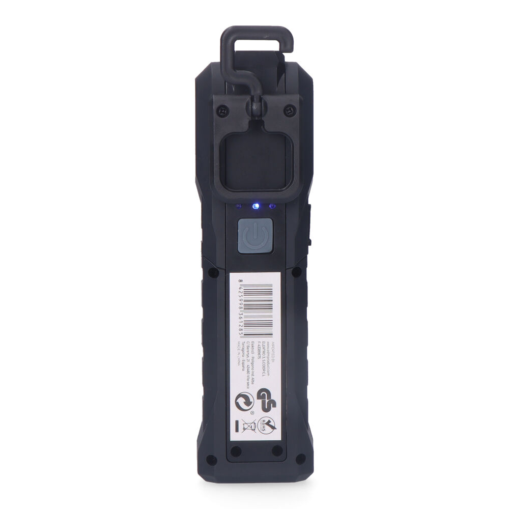 LINTERNA DE TRABAJO LED, COB REDONDA 200lm 5W 4.200K + COB FRONTAL 200lm 5W 6.500K + SPOT SUPERIOR 50lm 3W 6.500K. MATERIAL: ABS + ALUMINIO. BATERIA 1500mAh DE LITIO INCLUIDA RECARGABLE.CARGA USB TIPO C , CABLE INCLUIDO. CARGA DE 3,5HORAS. INDICADOR DE BATERIA. HASTA 8 HORAS DE AUTONOMÍA. INCLUYE BASE BASCULANTE 180º, GANCHO PARA COLGAR Y BASE IMANTADA. MEDIDAS:40 x 42 x 154 mm.