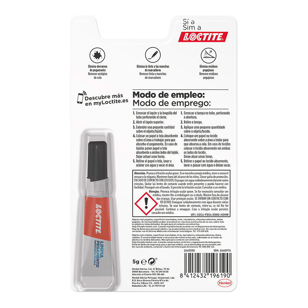 LOCTITE LIMPIA PEGAMENTO 5g MAXIMA EFICACIA PRACTICO Y LIMPIO. ELIMINA LOS RESTOS DE CASI TODOS LOS PEGAMENTOS EN OBJETOS MAL PEGADOS, ROPA MANCHADA Y DEDOS. SUPER GLUE