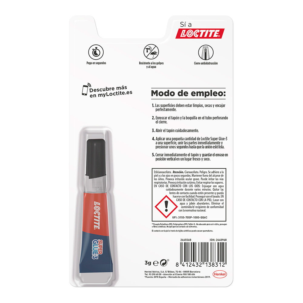 LOCTITE ORIGINAL 3g ADHESIVO UNIVERSAL INSTANTANEO MAXIMA FUERZA UNION EN POCOS SEGUNDOS NUEVA FORMULA RESITENTE AL AGUA Y AL LAVAVAJILLAS PARA PEGAR EN POCOS SEGUNDOS TODOS LOS TIPOS DE MATERIALES: PORCELANA, MADERA, PLASTICO, METAL, GOMA, CUERO, MARMOL SUPER GLUE.