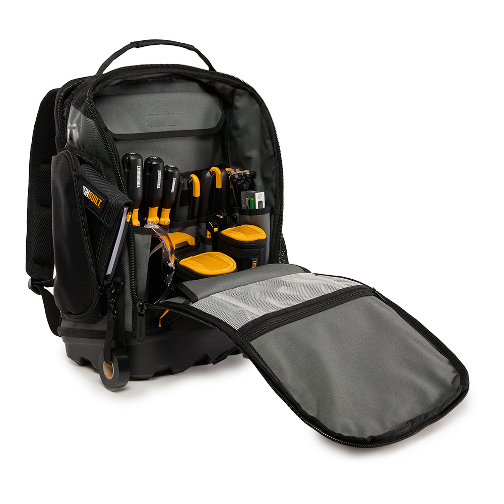 MOCHILA PORTAHERRAMIENTAS TB-66C TOUGHBUILT APTA PARA PORTÁTILES DE 13 A 17 PULGADAS. 31 BOLSILLOS Y SOPORTES. LA AMPLIA SOLAPA FRONTAL, PROPORCIONA FÁCIL ACCESO A TODAS LAS HERRAMIENTAS. BASE ROBUSTA TODOTERRENO. BOLSILLOS INTERNOS ABIERTOS Y CON CIERRE. BOLSILLO FRONTAL VERSÁTIL CON CREMALLERA Y HEBILLAS. CORREAS PARA EL HOMBRO ACOLCHADAS Y. TRANSPIRABLES. ASAS DOBLES. LOS ACCESORIOS DEL INTERIOR DE LA BOLSA SE VENDEN POR SEPARADO