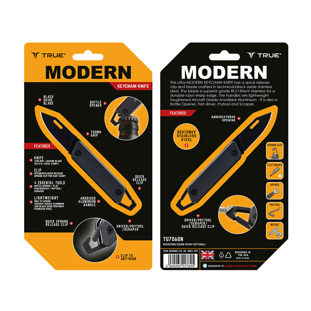 MODERN NAVAJA/LLAVERO MULTIUSOS CON CLIP TU7060N TRUE. LA MODERN ES UNA NAVAJA COMPACTA CON UN DISEÑO ELEGANTE Y MODERNO. ESTA NAVAJA DE TAMAÑO PERFECTO CUENTA CON UN CLIP MOSQUETON PARA ENGANCHARLA Y DESENGANCHARLA FÁCIL Y RAPIDAMENTE DE SU LLAVERO. LA HOJA EN PUNTA DE CLIP DE 3,8 cm ESTÁ FABRICADA EN ACERO INOXIDABLE 8Cr13MoV. CUENTA CON CUATRO UTILES ESENCIALES: ABRIDOR DE BOTELLAS, DESTORNILLADOR PLANO,PALANCA Y RASCADOR INCLUIDO.INCLUIDO TAMBIEN UN MOSQUETON DE FACIL APERTURA QUE LA CONVIERTEN EN UNA HERRAMIENTA PARA TENER SIEMPRE A MANO.