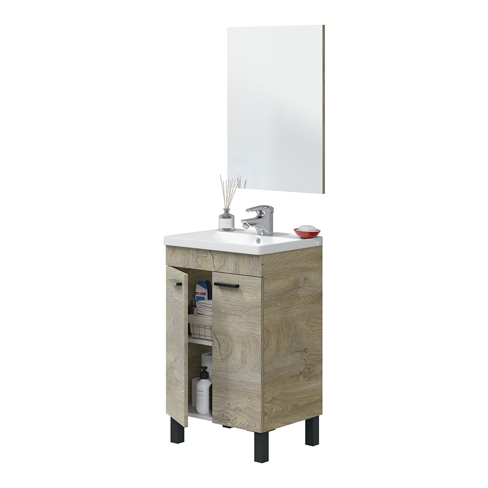 MUEBLE DE BAÑO CON 2 PUERTAS Y UN ESTANTE EN SU INTERIOR; LAS MEDIDAS DEL ARMARIO SON DE 50 cm (ANCHO) x 80 cm (ALTO) x 40 cm (FONDO) CON 4 PATAS DE 12 CM DE ALTURA DE ALUMINIO ANODIZADO CON EFECTO BRILLO. DESTACA POR SU DISEÑO MODERNO Y ELEGANTE Y EL COLOR ROBLE ALASKA. ADEMÁS, INCLUYE EL ESPEJO A CONJUNTO. MEDIDAS DEL ESPEJO: 50 cm (ANCHO) x 68 cm (ALTO) x 1,8 cm (FONDO). (LAVAMANOS, GRIFERÍA, SIFÓN Y VÁLVULA NO INCLUIDOS).