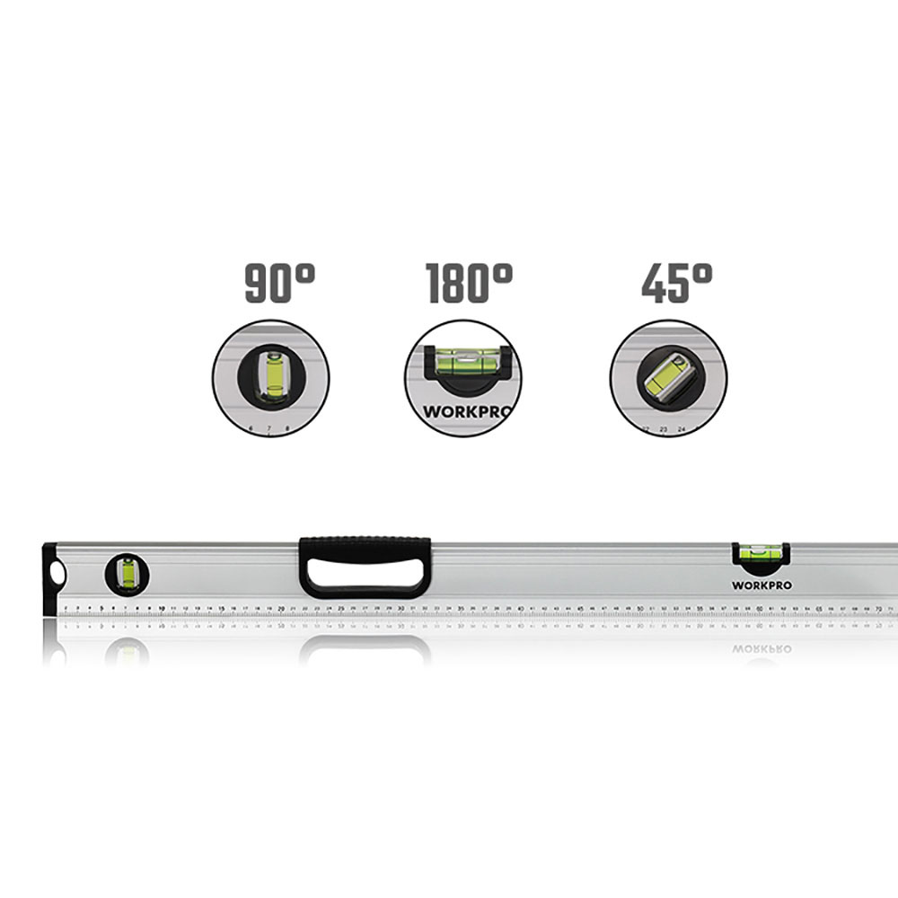 NIVEL DE BURBUJA 60cm. CONTERA A PRUEBA DE GOLPES. ALEACIÓN DE ALUMINIO. PRECISIÓN 1mm/1m, 3 VIALES (45°/90°/180°). WORKPRO