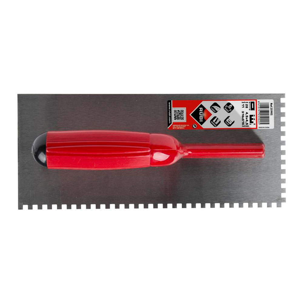 PEINE ACERO 28cm. (6×6) MANGO PLÁSTICO ABIERTO 25903 RUBI. LÁMINA DE ACERO. PARA APLICAR MORTERO COLA EN CERÁMICA DE FORMATO PEQUEÑO. DENTADO DE 6x6mm. MANGO DE PLASTICO ABIERTO. MEDIDA 28x14cm (ancho/fondo)