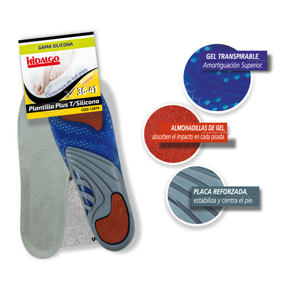 PLANTILLA PARA CALZADO PLUS SILICONA T: 36-41 HIDALGO. TRANSPIRABLES. ABSORBE EL SUDOR, AMORTIGUACIÓN, CONFORT Y ESTABILIDAD. MULTITALLA RECORTABLE, 36-41