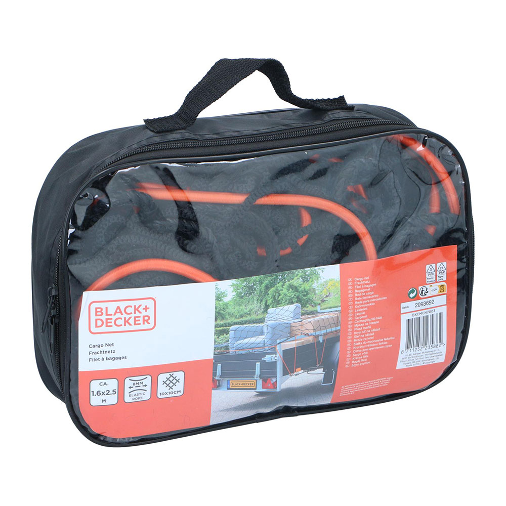 RED DE CARGA ELASTICA, MEDIDA: 1,6×2,5m, MALLADO 10x10cm. INCLUYE CUERDA ELASTICA DE 8mm. BLACK+DECKER