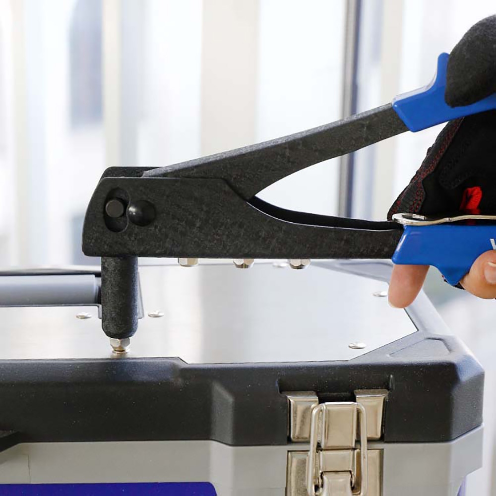 REMACHADORA DE MANO DE 250mm. MORDAZAS DE CROMO MOLIBDENO. CONSTRUCCIÓN DE ACERO CON MANGO ERGONOMICO. EL MANGO CON RESORTE EXPULSA EL VÁSTAGO DEL REMACHE AUTOMÁTICAMENTE. SE ADAPTA A TAMAÑOS DE REMACHES: 2,4 – 3,2- 4 Y 4,8. CON LLAVE PARA INTERCAMBIAR LAS BOCAS ALMACENADA EN EL MANGO. CON RETENEDOR PARA CUANDO SE GUARDE. COLOR AZUL. WORKPRO