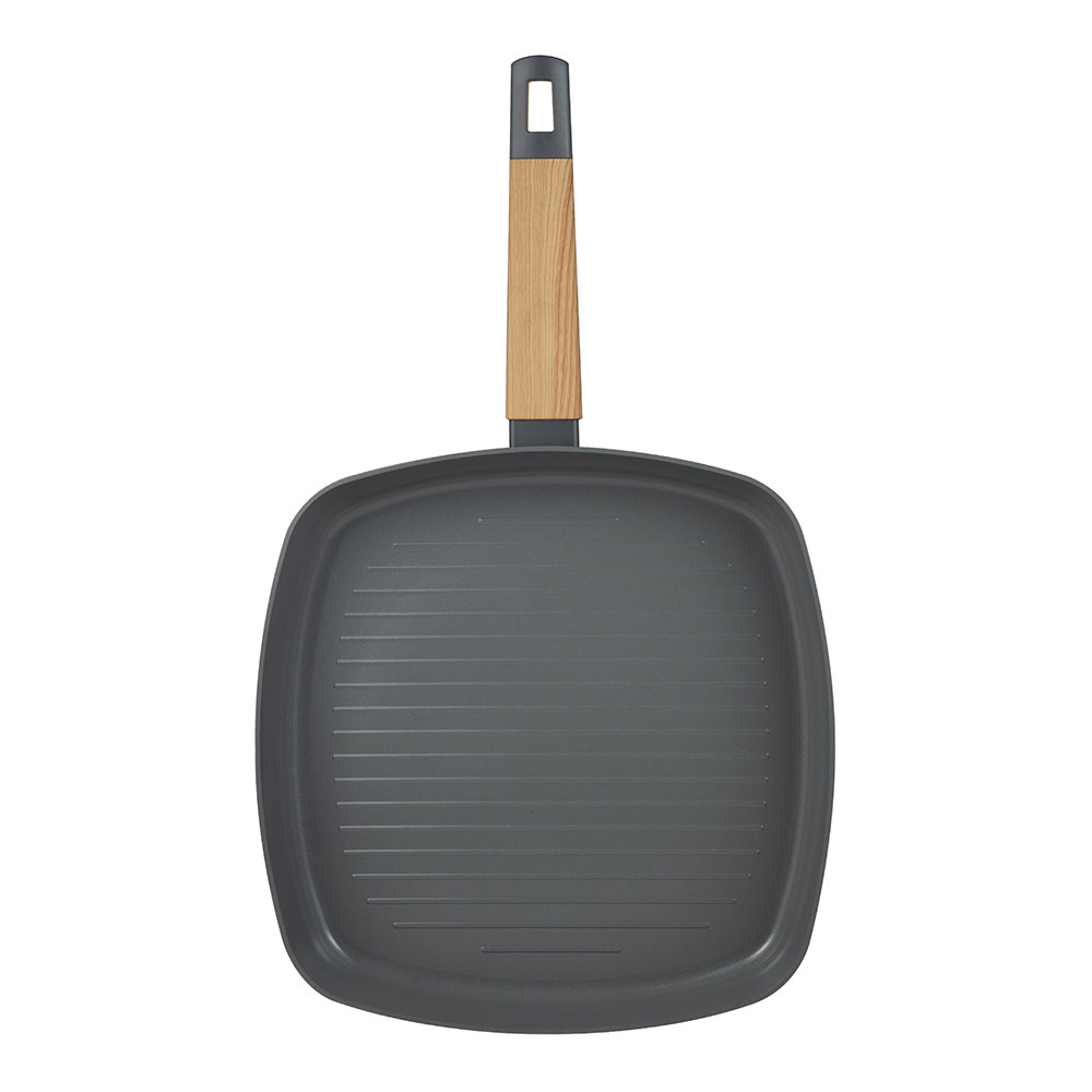 SARTÉN GRILL ALUMINIO PRENSADO. INTERIOR PPG FUSION EN COLOR GRIS. EXTERIOR EN COLOR GRIS. Ø28 cm. PUNTO INDUCCIÓN CON DISEÑO. MANGO DE MADERA RESISTENTE AL CALOR CON TACTO SUAVE