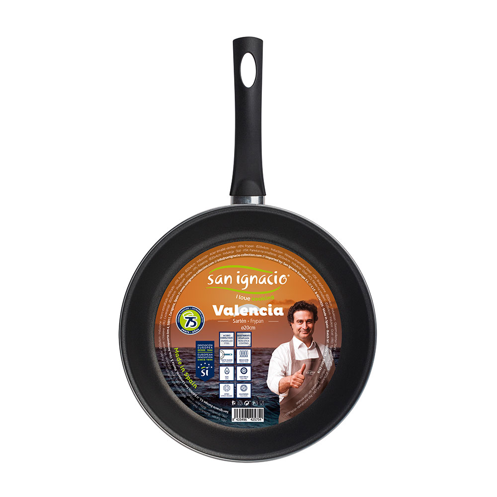 SARTEN Ø20x4cm ACERO CARBONO VALENCIA BGEU2518 SAN IGNACIO.REVESTIMIENTO ANTIADHERENTE SIN PFOA Y PTFE. COMPATIBLE CON TODOS LOS FUEGOS DEL MERCADO. MANGOS ERGONÓMICOS CON EFECTO «TACTO SUAVE».