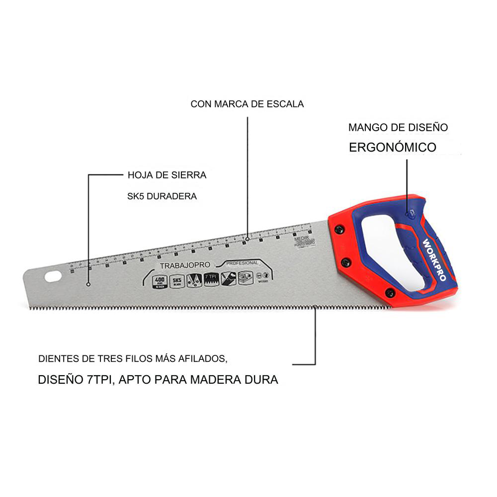 SIERRA DE MANO DE 400mm (16), 7TPI. MANGO DE DISEÑO ERGONOMICO. CON MARCA DE ESCALA. HOJA DE SIERRA SK5, MÁS DURADERA. DIENTES RECTIFICADOS TRIPLES. DISEÑO DE DIENTES GRANDES Y PEQUEÑOS PARA UNA ELIMINACIÓN DE VIRUTAS MÁS RÁPIDA Y UNA MAYOR EFICIENCIA. ADECUADO PARA CORTES RÁPIDOS DE MADERA, BAMBÚ, PVC Y OTROS MATERIALES. WORKPRO