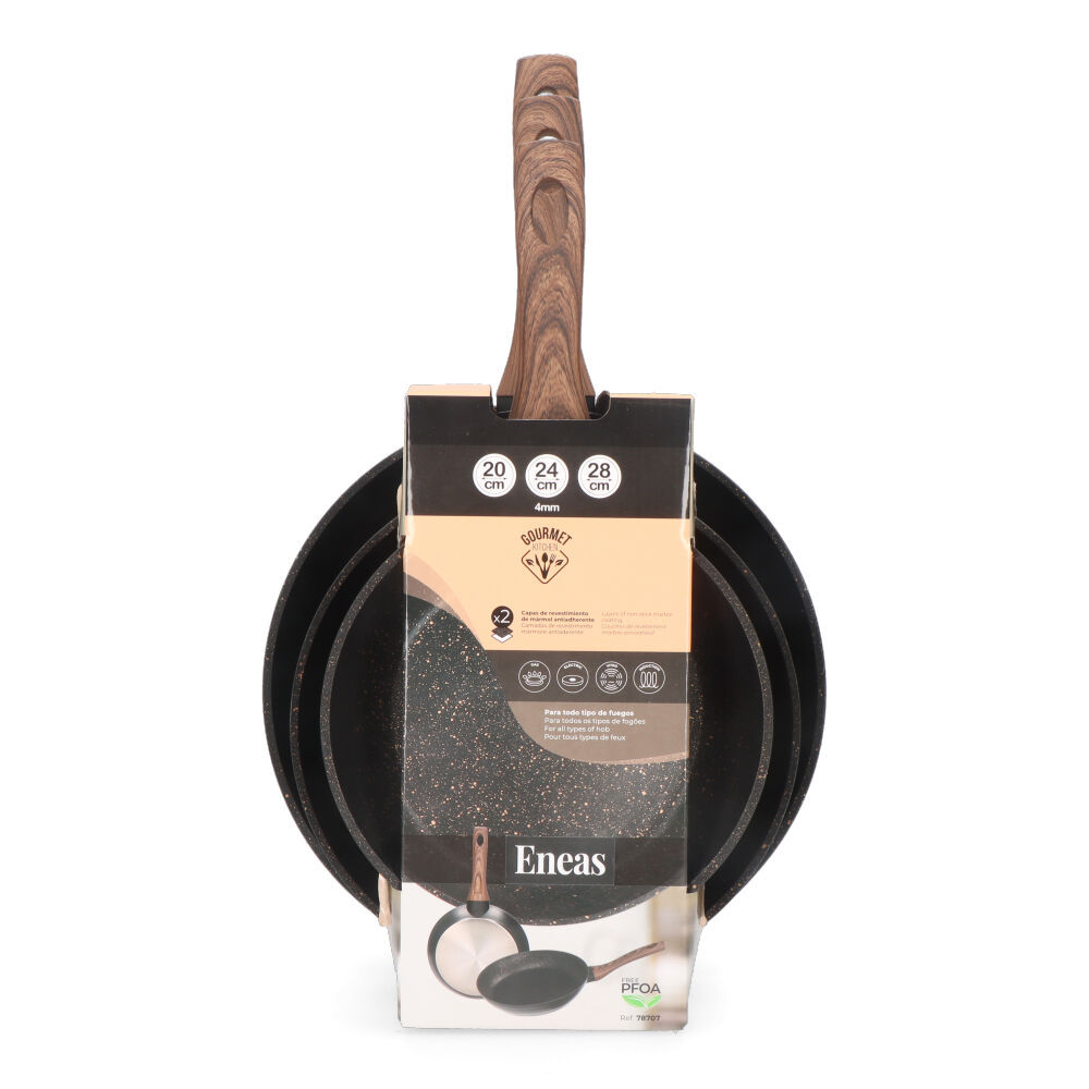 SET DE 3 SARTENES ANTIADHERENTES «SERIE ENEAS» GOURMET KITCHEN: INCLUYE SARTEN DE Ø20×4,5cm, Ø24×4,7cm, Ø28×5,5cm. APTA PARA INDUCCIÓN, VITROCERÁMICA, GAS Y PLACA ELÉCTRICA.