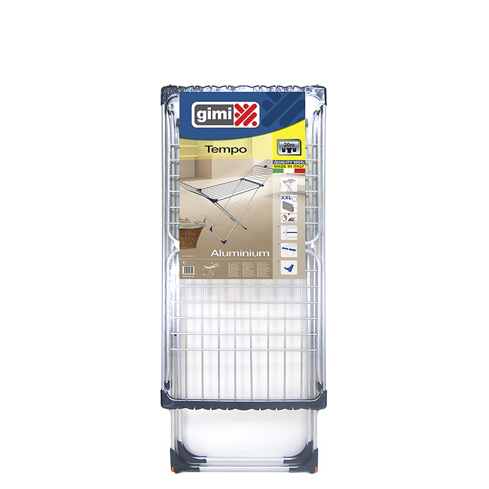 TENDEDERO TEMPO GIMI 153773. TENDEDERO 100% ALUMINIO. ESTRUCTURA ANTI OXIDO, VARILLAS GRUESAS, INCORPORA RUEDAS, ANGULARES ANTIDESLIZANTES, PROTECTORES ANTIRALLADURAS Y BLOQUEO DE ALAS. ESPACIO DE TENDIDO 20m