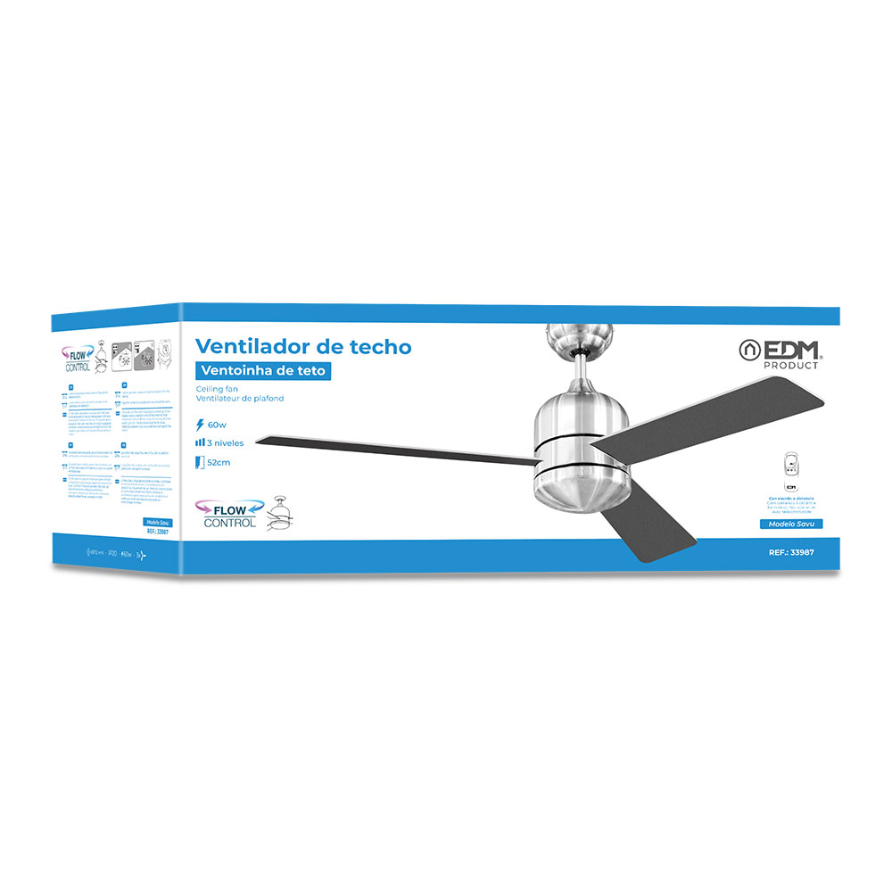 VENTILADOR DE TECHO MODELO SAVU. COLOR CROMO CEPILLADO. POTENCIA: 60W ASPAS: Ø115cm. 3 VELOCIDADES. CAUDAL DE AIRE: 6972m³/h. AC 220-240V 50Hz CON MANDO A DISTANCIA. 3 ASPAS DE 52cm IP20 EDM